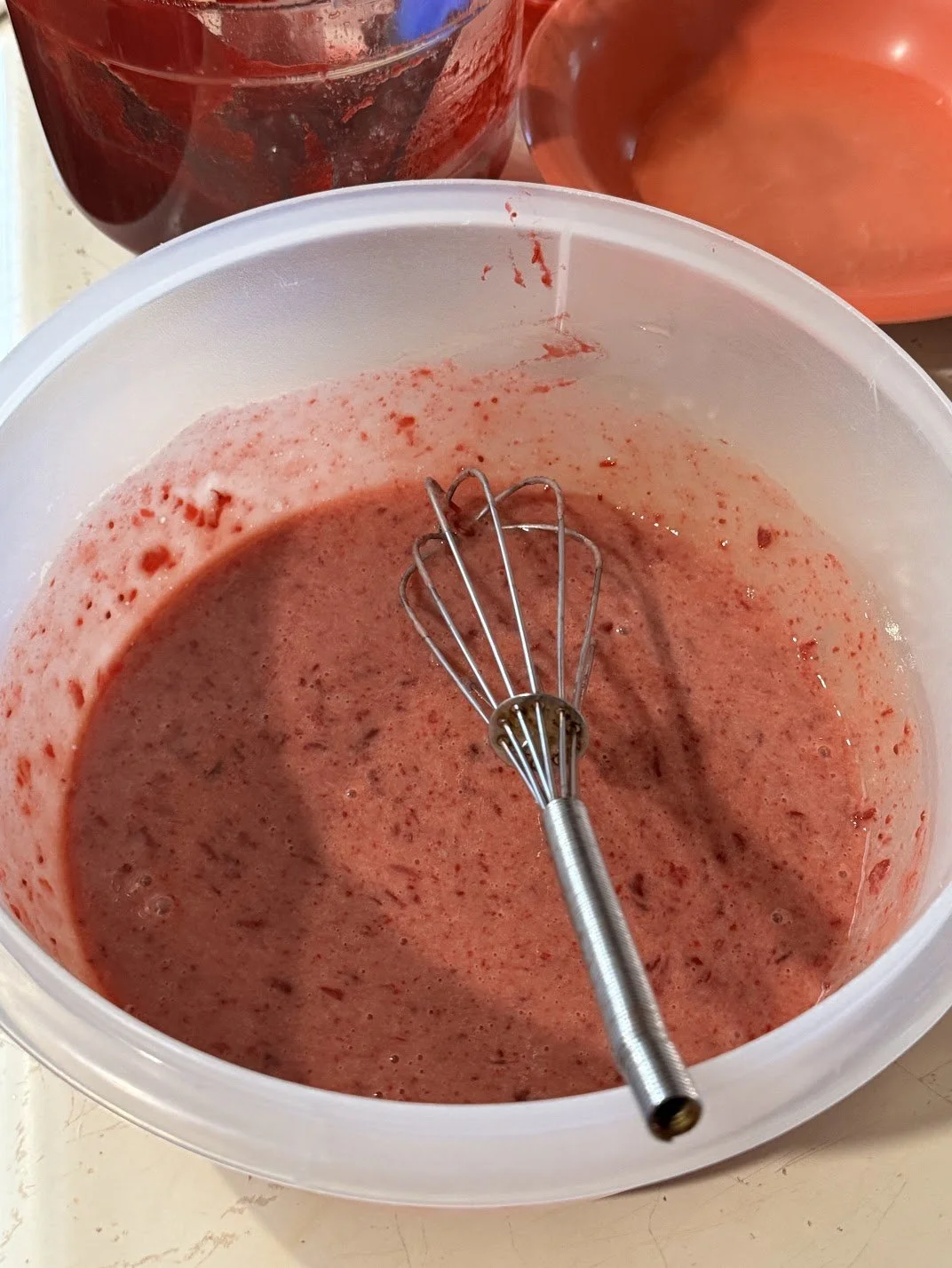 Mix the eggs and cranberries together. Be careful though, you don’t want to cook your eggs. add small amounts of the blended cranberries to the eggs and mix in until fully mixed.