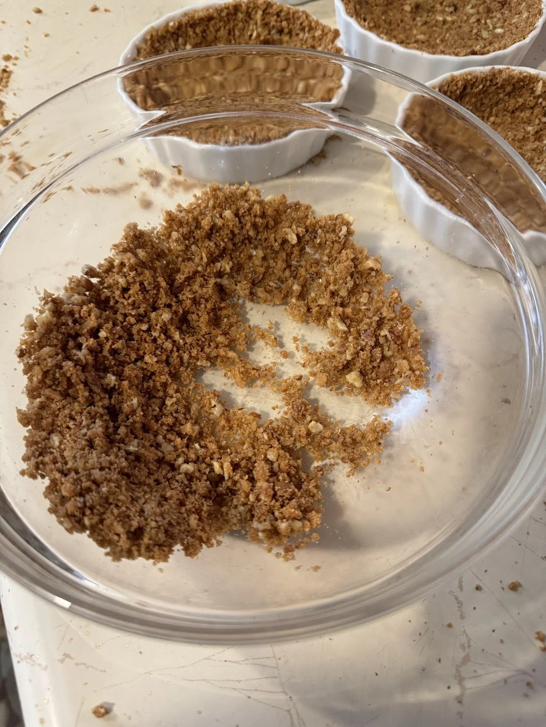 Pour the blended mixture into a bowl and melt the butter in a microwave safe container. Once melted, add the butter into the bowl with the blended gingersnap cookies, pecans, and sugar and mix together. Note, this is easiest to do with your hands. Mix until all the butter is mixed and most of the texture is moistened by the butter.