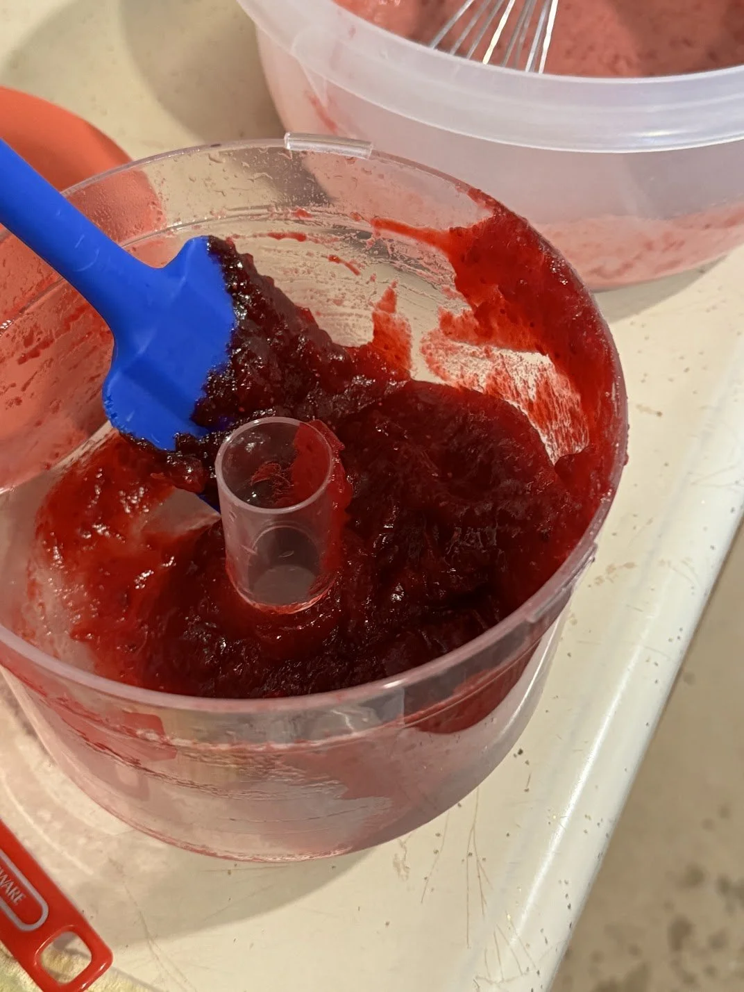 Once the cranberries are finished simmering, let cool a little bit (probably about 5 to 10 minutes). While it’s cooling, get your eggs and egg yolks mixed in a bowl. When the cranberries have cooled a bit, put in food processor and blend until smooth.