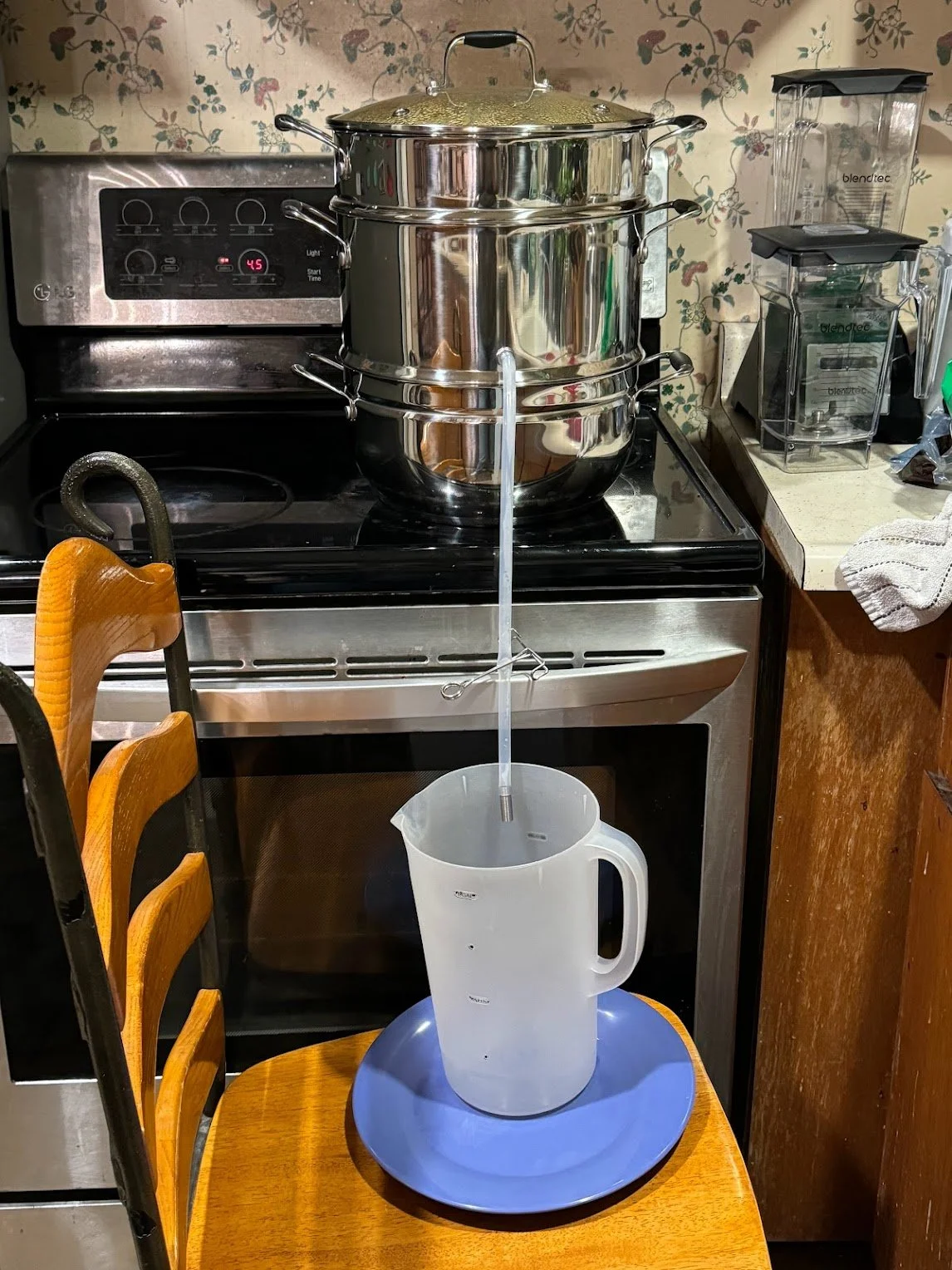 I steamed about 2 bushels of apples: 1 bushel of honeycrisp, ½ bushel of ambrosia, and 1/s bushel of a tart apple (I can’t remember the name, I just grabbed the most tart apple I could find at the orchard). It made about 2.5 to 3 gallons before concentrating.