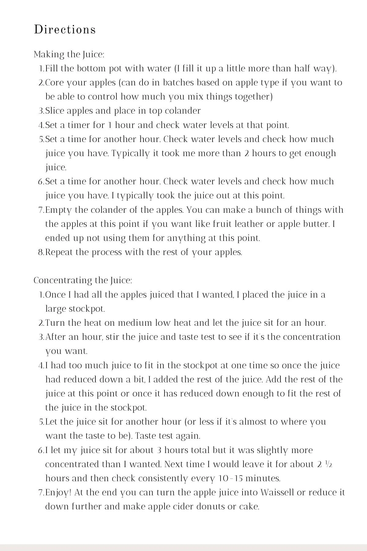 So many things make me think of fall and cozy weather, but especially apple cider. It’s a flavor and smell that brings up so many memories for me: Trick-or-Treating when I was little, Christmas with Waissell, camping with warm apple cider in the morning. For a long time I thought apple juice wasn’t even something that I could make. My sister-in-law, makes and cans delicious grape juice, and uses a steam juicer. I started looking up what I could use in a steam juicer, and lo and behold! I could make apple juice! I could make my very own Waissell from homemade apple juice! I was talking to my family about this and got a steam juicer for my birthday the beginning of October and was so excited to use it! What a perfect time to try making apple juice!